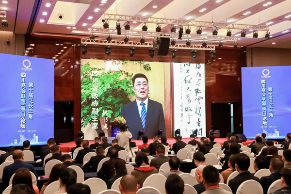 四川省政协副主席林书成通过视频连线为本届论坛发来贺词,他指出,泛长三角四川商会联盟成立以来,在八省一市的四川商会不断努力下,论坛成果不断深化,区域影响不断扩大,品牌效益不断增强,已经成为四川与泛长三角地区和闽赣地区经济合作的重要桥梁。希望广大川商以商会为平台,坚持政治建会、团结立会、服务兴会、改革强会的要求来推动商会的可持续发展,切实发挥好桥梁和纽带作用,努力促进川闽两地在经济文化等领域的交流与合作;同时希望广大川商登高望远,大力弘扬新时代川商精神,打造川商传奇、成就川商经典、畅想川商品牌,在努力奔跑中创造新的辉煌。