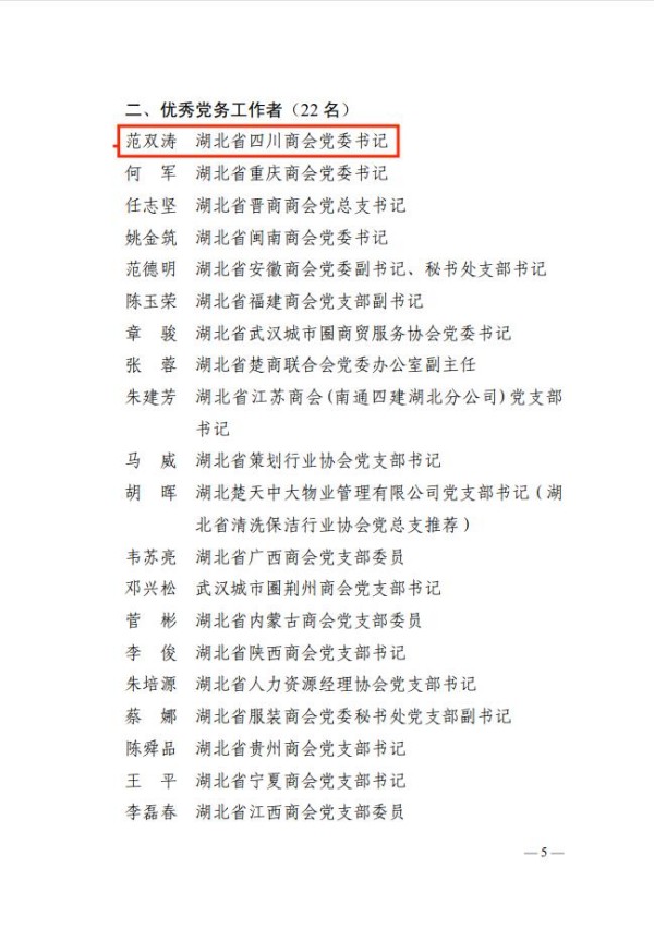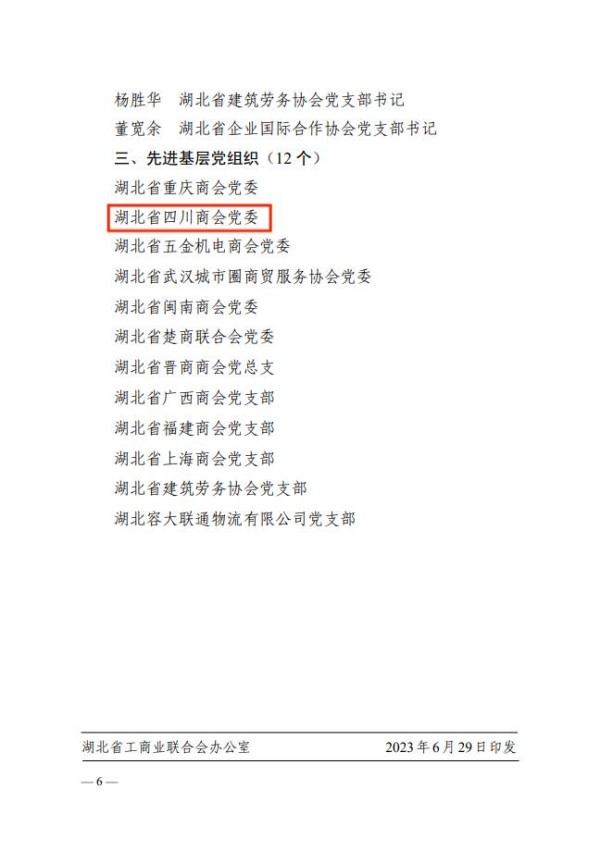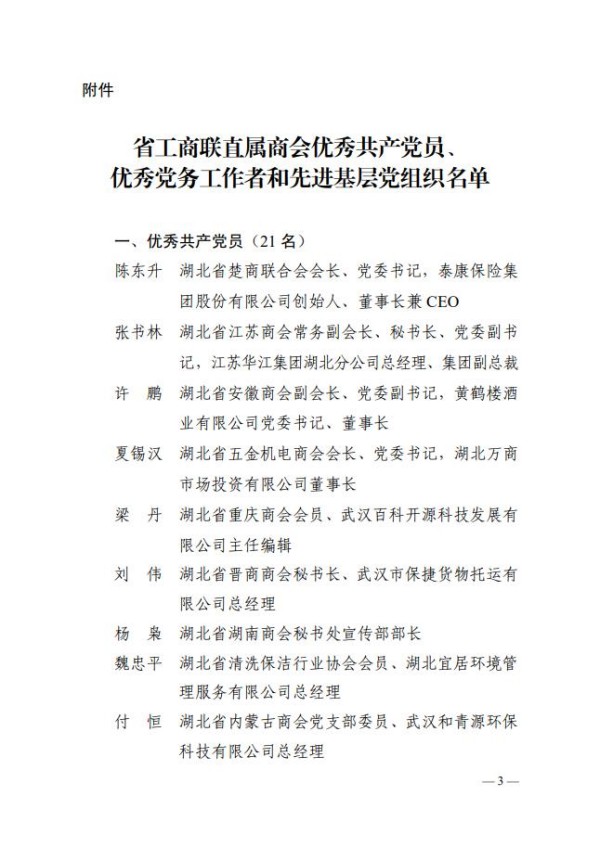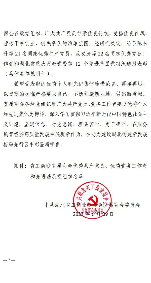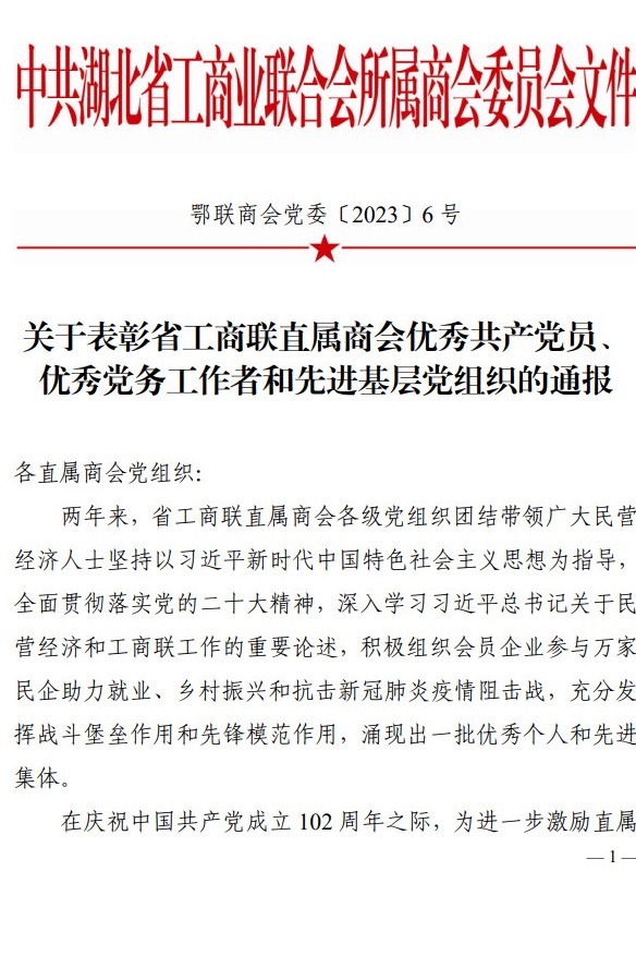 通报指出,两年来,省工商联直属商会各级党组织团结带领广大民营经济人士坚持以习近平新时代中国特色社会主义思想为指导,全面贯彻落实党的二十大精神,深入学习习近平总书记关于民营经济和工商联工作的重要论述,积极组织会员企业参与万家民企助力就业、乡村振兴和抗击新冠肺炎疫情阻击战,充分发挥战斗堡垒作用和先锋模范作用,涌现出一批优秀个人和先进集体。在庆祝中国共产党成立102周年之际,为进一步激励直属商会各级党组织、广大共产党员继承优良传统,发扬优良作风,营造干事创业、创先争优的浓厚氛围。经研究决定,对21名优秀共产党员、22名优秀党务工作者和12个先进基层党组织通报表彰。
