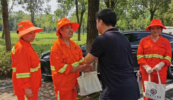 在慰问活动中,湖北省四川商会常务副会长,医养大健康委员会主任吴文彪,湖北省四川商会副会长、医药党支部书记税德君、湖北省四川商会副会长王胜吉等商会代表与环卫工人进行互动交谈,了解他们的工作和生活状况,向环卫工人致以亲切问候,送上生活必需品和清凉饮料表达对他们在炎炎夏日辛苦工作的敬意。