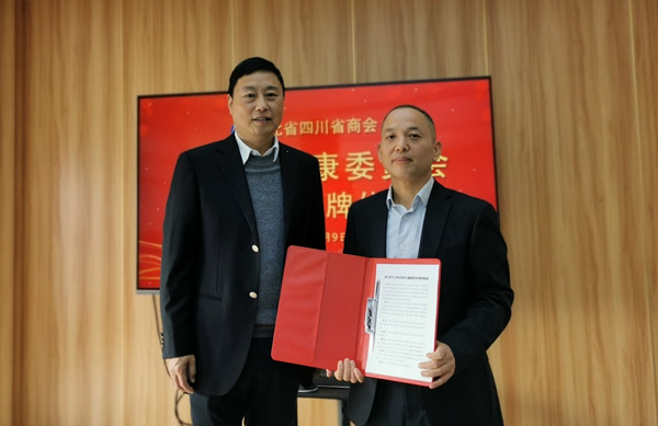 梁强会长代表商会热烈祝贺的医养大健康委员会成立并向医养大健康委员会主任吴文彪颁发了《湖北省四川商会医养大健康委员会管理制度》。