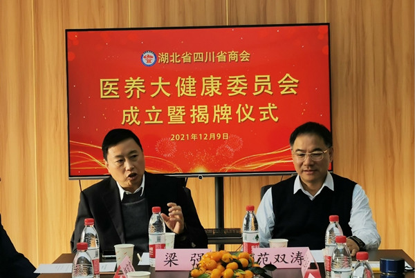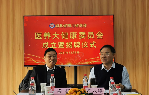 梁强会长、范双涛党委书记、吴文彪主任和税德君党支部书记共同为湖北省四川商会医养大健康委员会揭牌。